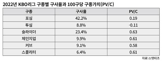 최근 8시즌(2015~2022년) 동안 PV에서 포심이 투심보다 높았던 시즌은 2016년과 올해 딱 두 번이다. 올해는 2016년보다 더 특별하다. 2022년 포심 100구당 구종가치(PV/C)는 0.19로 이 기간 가장 높다. 2016년엔 -0.49였다.