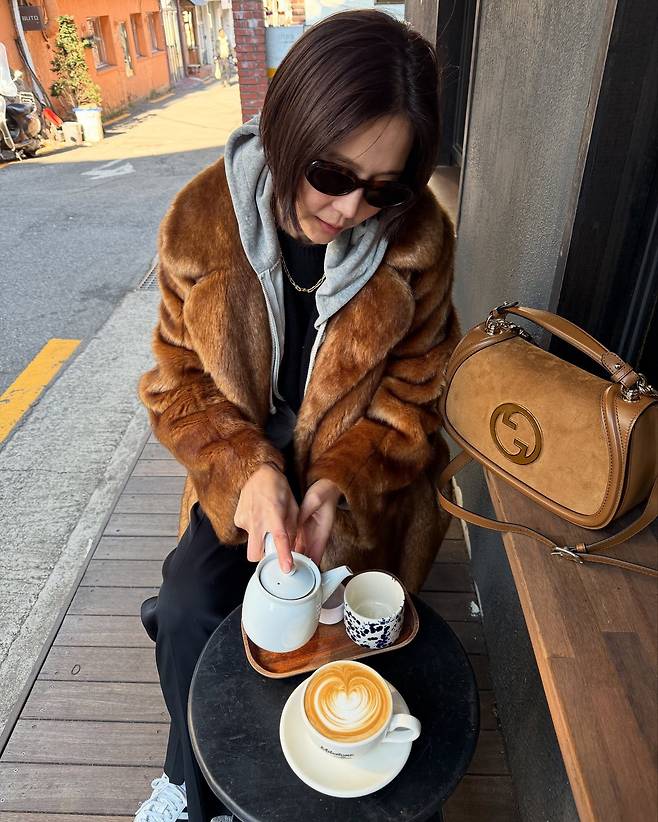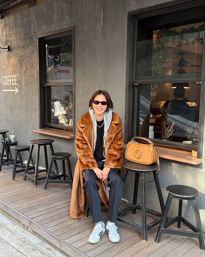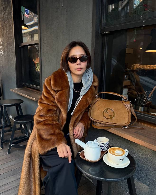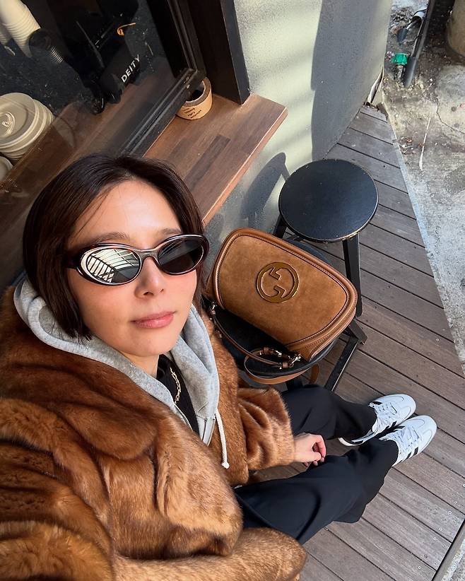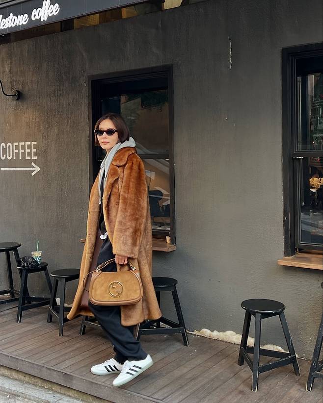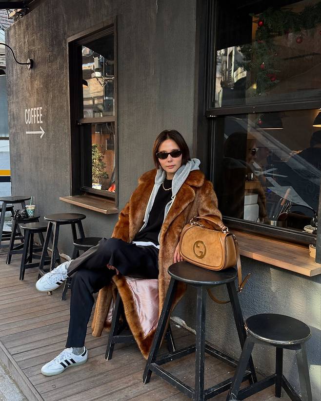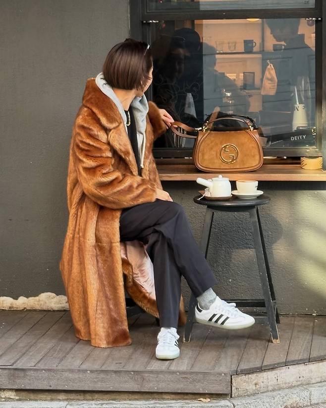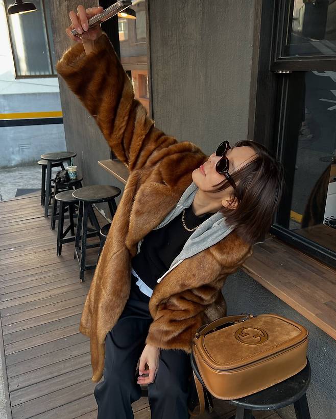 또한 퍼코트와 같은 톤의 백을 매치해 스타일리시한 패션을 완성했습니다.