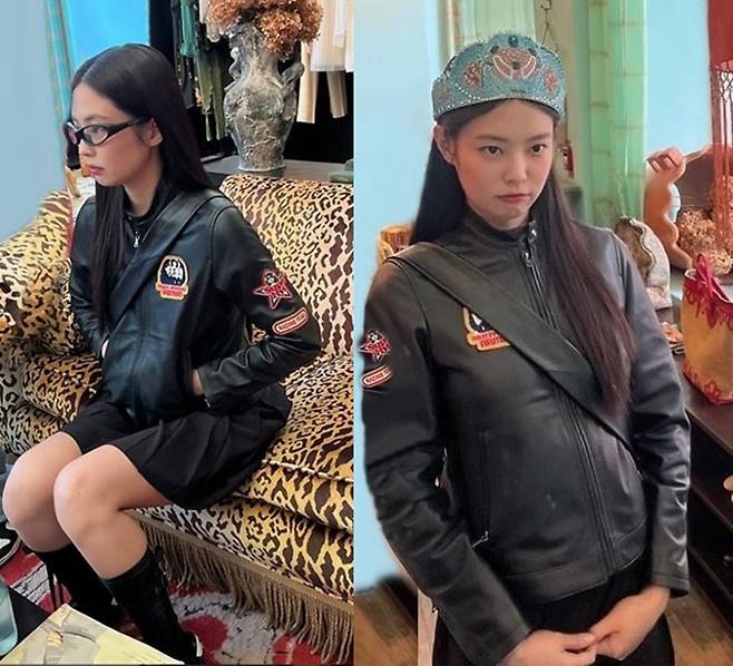 사진 속 제니는 블랙 가죽 재킷과 미니 플리츠 스커트, 여기에 티아라를 매치한 러블리한 프레피룩으로 여유로운 시간을 보내는 모습이 담겼다.