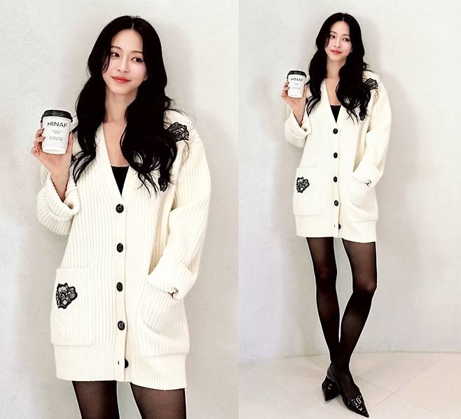 한예슬은 오버사이즈 화이트 카디건에 블랙 레이스 디테일이 들어간 디자인을 선택해 단조로울 수 있는 스타일에 포인트를 주었습니다.
