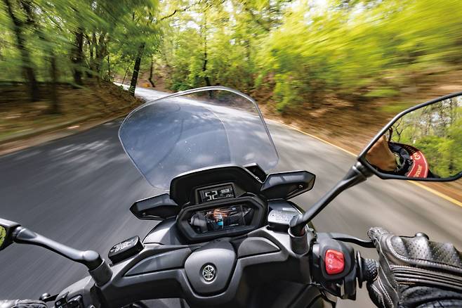페이스리프트에 가까운 변경이다 보니 기본적인 동력성능은 그대로다. 하지만 주행성능은 크게 흠잡을 데가 없었다. 원래부터 미들클래스에서 주행 성능이 가장 좋은 모델로 꼽혔고 이는 변하지 않았다. 가속 성능은 정지 상태에서 시속 100km까지 계기반 기준 약 9초인 클래스 평균으로 무난하다. 하지만 292cc 엔진에서 나오는 풍부한 토크로 스로틀을 열면 주저없이 속도를 붙여준다. 스쿠터지만 130km/h까지 가볍게 가속할 수 있고 최고속은 140km/h언저리다. 핸들링 감각은 ‘역시 야마하’라는 탄성이 나오게 만든다. 스쿠터 특유의 부유하는 감각이 아닌 바퀴가 제대로 노면을 짚어가며 돌아가는 느낌을 전달한다.