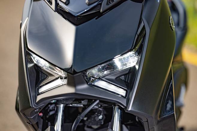 2023년형으로 새롭게 업데이트 된 XMAX의 가장 큰 변화는 디자인에서 시작된다. 이름에 어울리는 X자형 헤드라이트를 중심으로 더욱 간결하게 다듬어진 라인은 더 강렬한 인상을 뿜는다. 방향지시등은 하단에서 헤드라이트 위쪽으로 자리를 옮겨 피시인성을 높였다. 프론트 펜더 디자인 역시 새롭게 변경되었다. 쐐기처럼 아래로 뻗은 디자인이 전면 페어링부터 펜더까지 연결되어 더욱 강인한 인상이 된다.