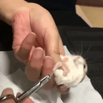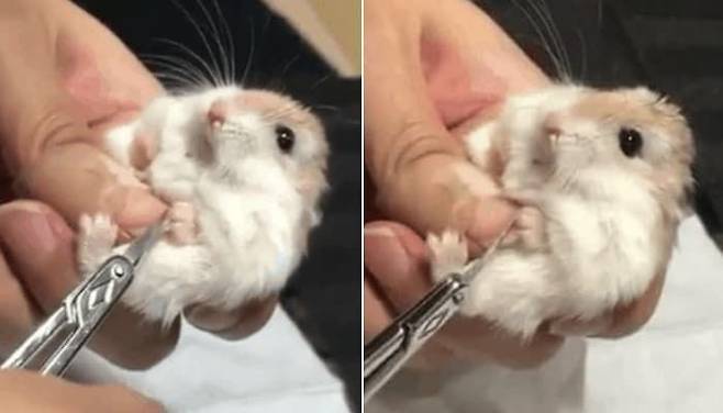 이날 실제로 공개된 움짤에 따르면 집사는 햄스터를 손으로 붙잡은 다음 뾰족한 가위를 활용해서 길게 자란 햄스터의 발톱들을 차례로 하나둘씩 정리해줬습니다.