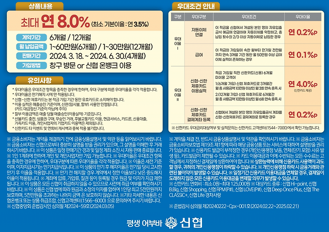 계약기간은 6개월과 12개월로 선택할 수 있으며 6개월은 월 납입금액 1~60만원 까지, 12개월은 1~30만원까지 납입이 가능하다. 신협은 해당 상품을 2024년 3월 18일부터 2024년 6월 30일까지 약 4개월간 창구와 신협 온뱅크 어플리케이션을 통해 판매한다.