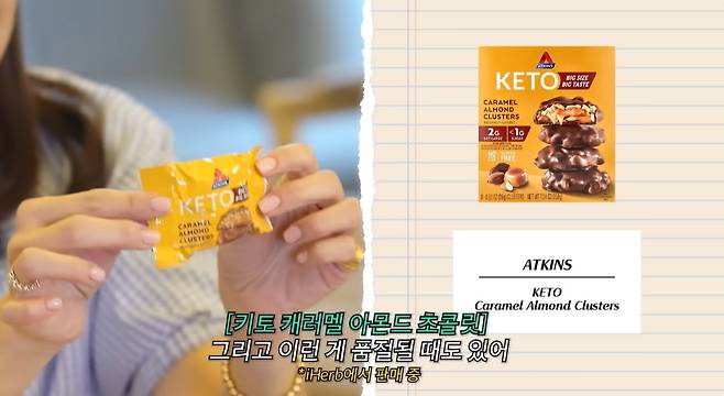 당 섭취에 신경을 쓴다는 강주은이 다른 영상을 통해서도 여러번 언급하고 소개한 제품이다. 앳킨스(Atkins)의 '키토 캐러멜 아몬드 초콜릿'은 키토 다이어트에 적합한 저탄고지 저당 간식으로, 캐러멜과 아몬드 클러스터가 들어 있다.