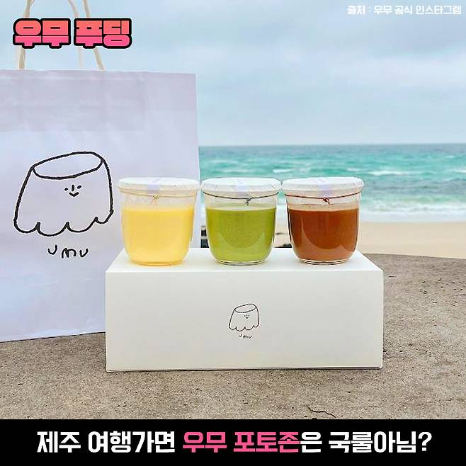 우무 카페 포토존에서 사진 찍는 거 다들 SNS에서 보셨죠? 그만큼 관광객들에게 핫플레이스인 곳이에요. 우무는 푸딩을 판매하는 곳인데 제주 해녀가 채취한 우뭇가사리를 오랜 시간 끓여서 만든 특별한 푸딩이랍니다!