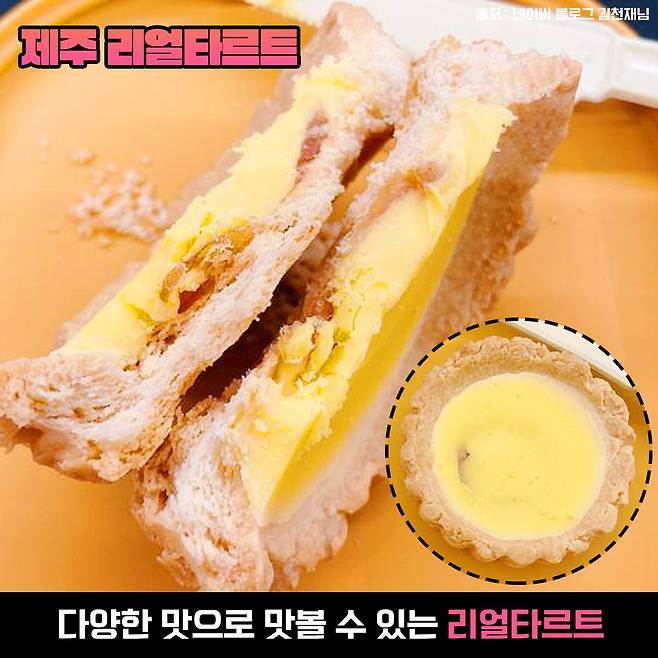한라봉, 천혜향, 녹차, 우도땅콩 4가지 맛으로 구성되어 있는 리얼타르트! 손바닥만 한 크기로 타르트마다 다양한 크림과 안에 들어있는 사과잼이 달달하니 먹기 좋다고 하네용~
