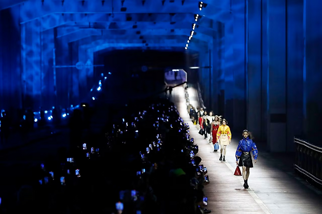 모델들은 루이비통 여성 컬렉션의 아티스틱 디렉터 니콜라 제스키에르(Nicolas Ghesquière)가 디자인한 기하학적 패턴의 스포티한 애슬레저 디자인룩으로 24시간 동안 교통이 정지된 795미터(2,608피트) 다리를 활보했다.