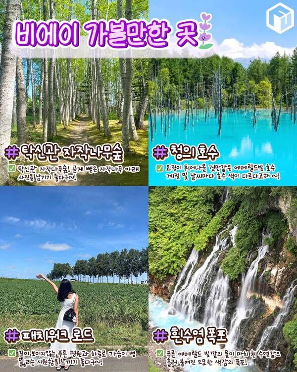 그 외에 함께 방문하면 좋은 요정이 튀어나올 것만같은 에메랄드빛의 청의 호수와 오묘한 색감의 흰수염 폭포, 끝이 보이않은 비에이의 푸르름을 느끼기 좋은 패치워크, 자작나무 숲이 인상적인 탁신관까지 다채로운 비에이니 여름철 삿포로 여행시 꼭 방문해보시길 바랍니다.