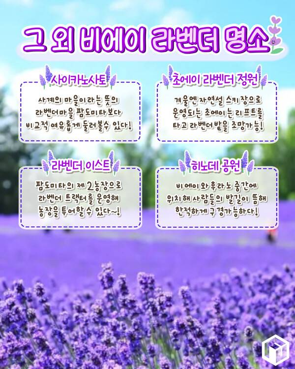 홋카이도 비에이 지역에는 팜도미타외에도 다양한 라벤더 명소가 있습니다. 그 중 가볼만한 3곳을 함께 소개해드릴테니 혹여 팜도미타외 다른 라벤더 명소를 구경하시고 싶거나 팜도미타 붐빌시 방문해보시길 바랍니다.