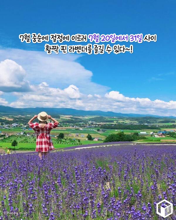 여름철 삿포로 여행은 곧 라벤더라는 말이 있을 정도로 일본 홋카이도의 라벤더밭은 일본 내에서 유명한 관광지입니다. 홋카이도 라벤더 개화시기는 대략 7월 중순부터 시작해 7월말까지 절정으로 꽤 오랜 기간 라벤더를 만나보실 수 있습니다.
