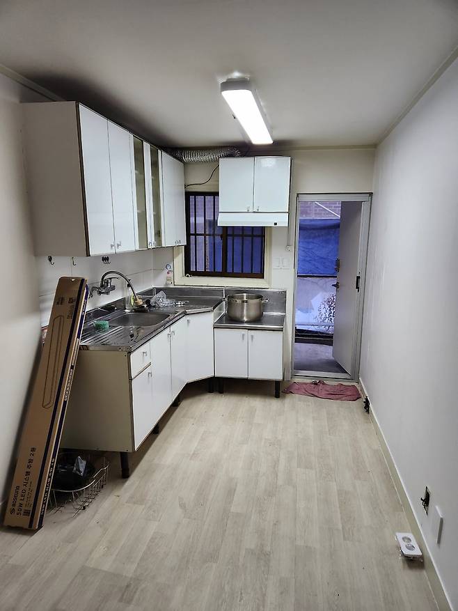 다음으로 소개해 드릴 공간은 주방이에요. 이곳은 전에 지내시던 분이 요리를 좋아하셨는지 원래 찌든 때가 너무 심했던 모습이었어요. 상하부장 시트지는 모두 울어서 벗겨져 있었고요. 셀프 시공이 꼭 필요했고 결국 저는 시트지를 제거하고, 버터 색, 연보라색 시트지를 붙여 리폼해 주었습니다.