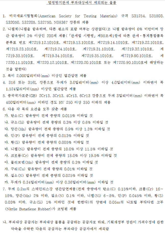 관세 적용 및 수출가격 인상 예외 품목으로는 중소 수요업계의 부담 완화와 제품 가격 안정, 수급 원활화를 위한 조치로 원심서부터 일부 200계 스테인리스 제품 등에 대해 ‘관세부과 제외’가 결정된 바 있다. 부과 제외 대상이 되는 제품들은 △200계(니켈함량 6% 미만) 제품과 △폭 2,000㎜ 이상의 제품 △일부 열연 316·316L 강종 △일부 STS 420 강종 △ 일부 인·황·구리 저함유 304L 강종 등이다.
