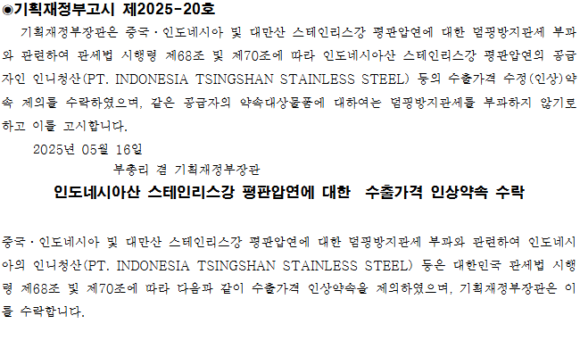 기획재정부가 산업부 무역위원회의 중국·인도네시아·대만산 스테인리스 평판압연 제품 반덤핑 일몰제심 최종 판결 결과(최대 25.82% 덤핑방지세 부과)를 수용한 가운데 조사대상 기업들의 요청으로 수출가격 인상약속을 체결했다고 밝혔다.