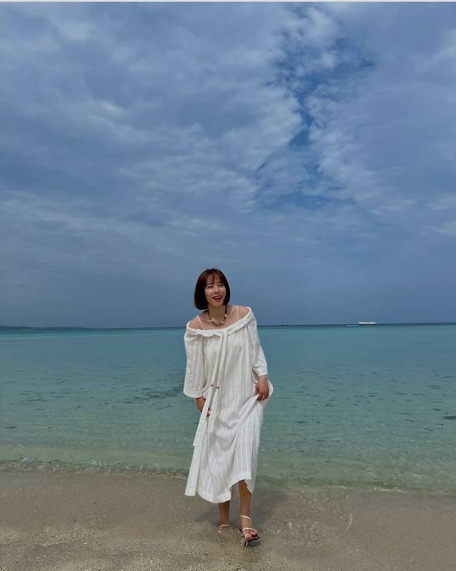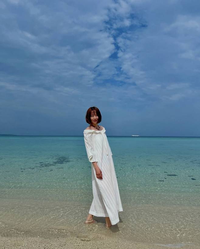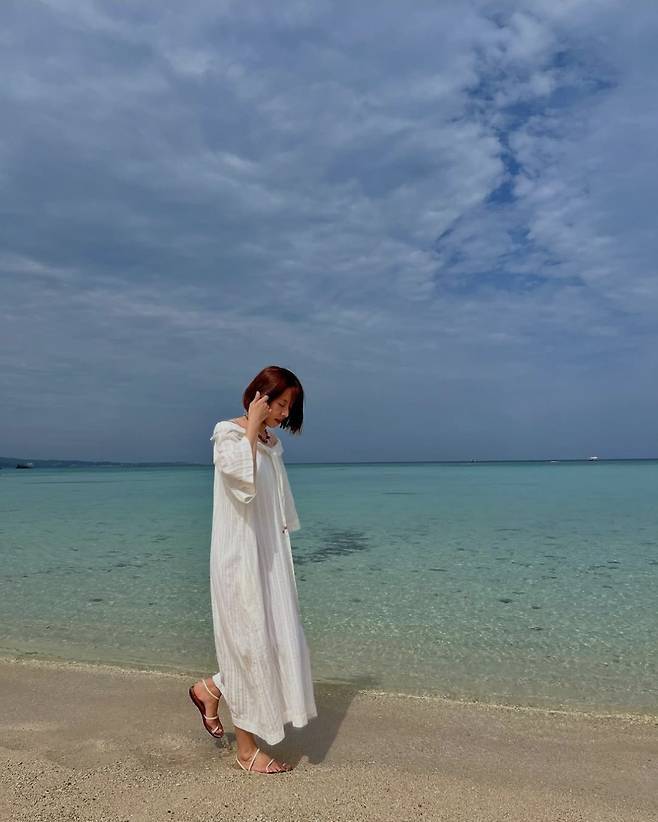 배우 조윤희가 바다와 하늘이 맞닿은 듯한 이국적인 풍경 속에서 청량한 화이트 롱 원피스를 입고 해변에서 영화의 한 장면을 연출했습니다.