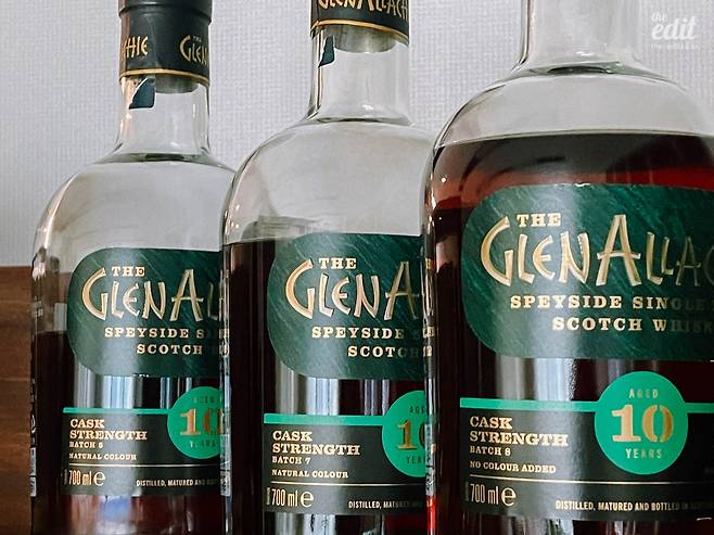 글렌알라키 10년 배치 시리즈는 ‘캐스크 스트렝스(Cask Strength)’ 위스키이기도 하다. 보통 ‘CS’라고 줄여서 부르는 이 위스키들은 물을 타지 않은 위스키 원액을 그대로 병입했음을 의미한다. 숙성을 마친 위스키 원액은 보통 50도 후반에서 60도 초반의 도수를 갖게 되는데, 우리가 마시는 대부분의 위스키들은 여기에 물을 타서 40도 정도로 도수를 낮춘 다음 병입한다. 원액 그대로는 도수가 너무 높기도 하고, 물을 타는 만큼 양도 늘어나니 판매하는 입장에서는 경제적이다. 반면 CS는 그렇지 않기 때문에 가격은 더 비싸지만, 원액 그대로의 높은 도수와 강렬한 풍미를 느낄 수 있다는 점에서 많은 애호가가 선호한다. 원액 그대로이기 때문에 58.6도, 62.3도 등 뒷자리가 딱 떨어지지 않는 소수점으로 되어있는 경우가 많다.
