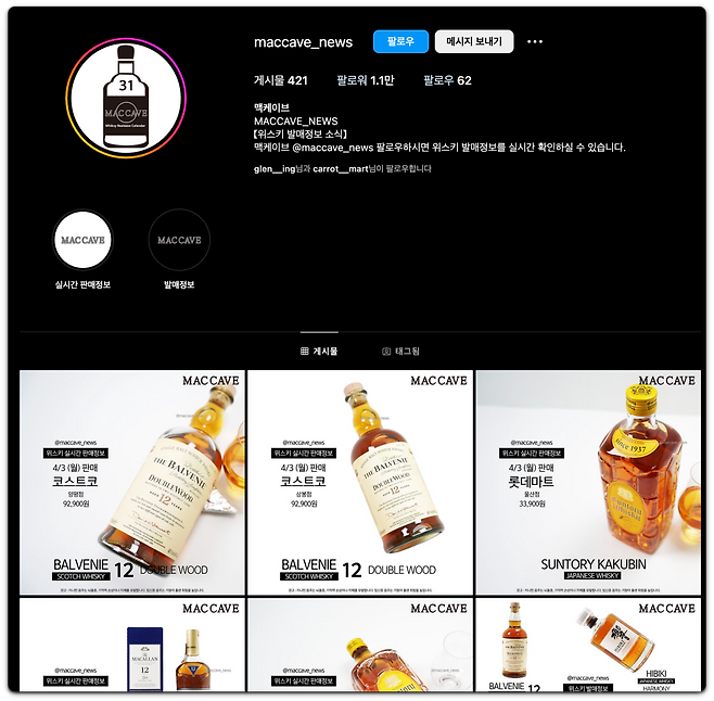 [위스키 발매 소식을 빠르게 전하는 인스타그램 계정 맥케이브 @maccave_news. 출처=맥케이브]
