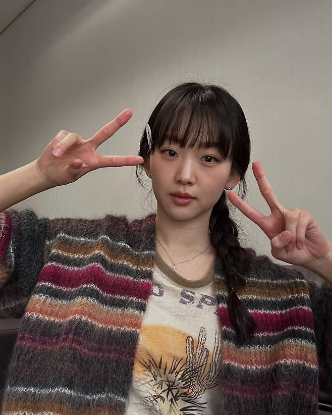 사진 속 그녀는 스트라이프 패턴이 돋보이는 니트 가디건을 걸치고, 빈티지한 그래픽 티셔츠를 매치해 캐주얼한 감성을 더했다.