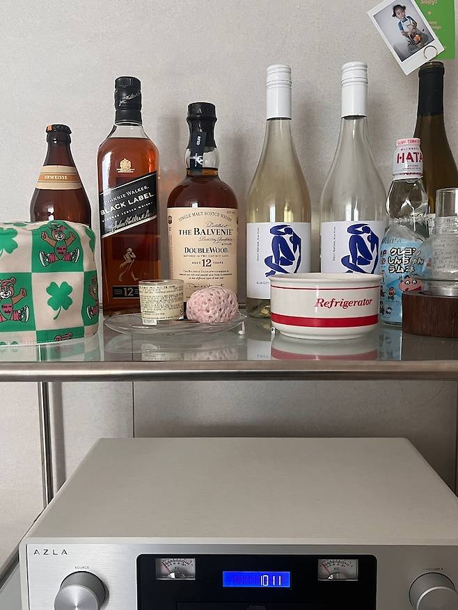 요리를 하다 보면 제가 하는 음식에 반해서 반주를 즐기는 편인데 분위기 있는 음악을 들으면서 힐링이 되고 있어요. 위스키나 와인은 선물 받은 거라 놔둔 것인데 사실 저는 0이슬 소주를 좋아합니다.
