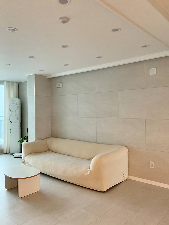 저희 집은 보시다시피 가구를 최소화했어요. 소파는 쎄덱 제품으로 2100짜리 패브릭 소파인데 예전에 이효리 언니 제주도 집에서 보셨던 제품이에요. 린넨 소재의 베이지 커버를 사용했는데 오래 사용하다 보니 원단 특성상 찢어지는 현상이 보이더라구요. 그래서 자주 세탁할 수 있도록 가성비 좋은 소파 커버로 바꿔두었어요.