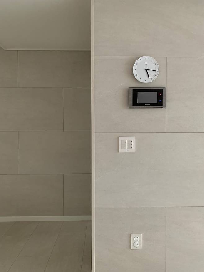 방들을 제외한 벽은 모두 디자인 월로 작업했고, 주방 타일도 현관과 동일하게 600*600으로 전체적으로 시공하였어요. 큰 차이는 없지만 저희 집은 개수대 위쪽만 상부장을 제외하여서 조금 덜 답답하게 만들려고 노력을 했는데 꽤 괜찮은 선택이였던 것 같아요.
