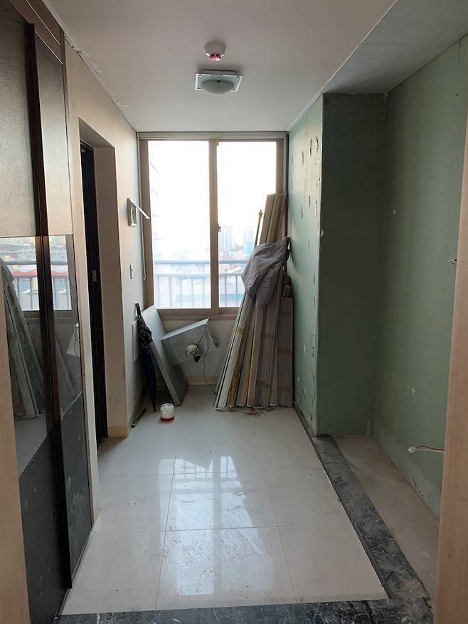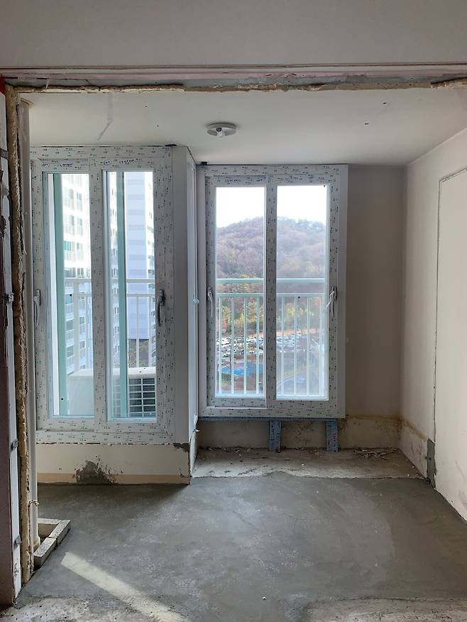 아이방은 아주 처음 사진이 따로 없는데 안방과 마찬가지로 창쪽에 화단과 베란다 샷시가 있었어요. 모두 철거해서 열선을 깔아준 상태의 예전 사진이에요.