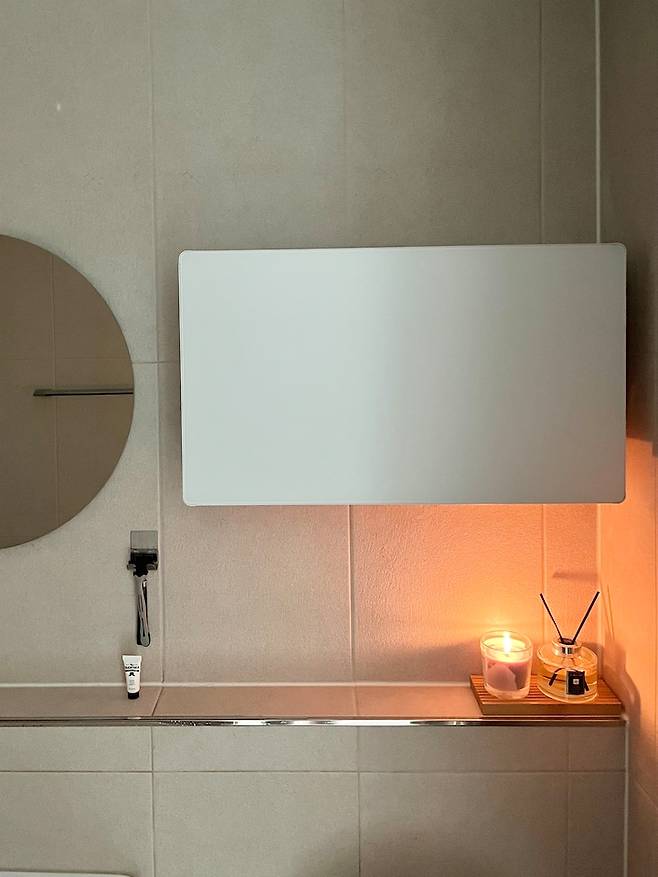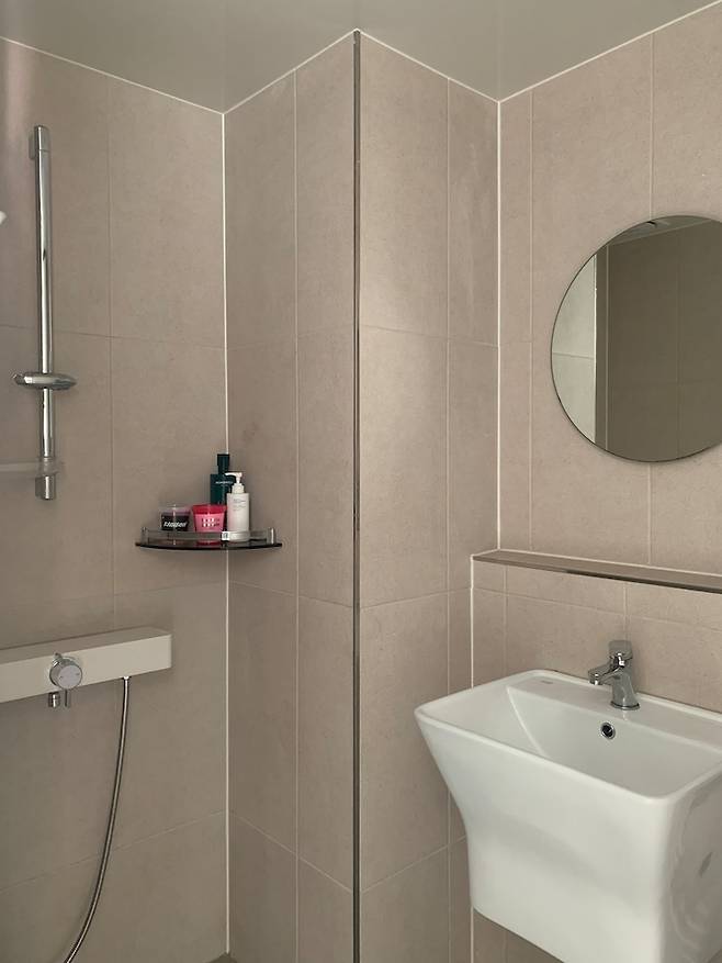 줄눈은 반짝반짝하는 게 싫어서 타일 색과 비슷하게 베이지로 했어요. 시공 업체 쪽에서 청소하기 힘들 거라고 극구 말리셨지만 제가 열심히 청소를 하면 되니까 상관 없었어요. 그런데 생각보다 청소하는 게 어렵지 않고 아직도 깨끗하게 유지하고 있는 편이에요.