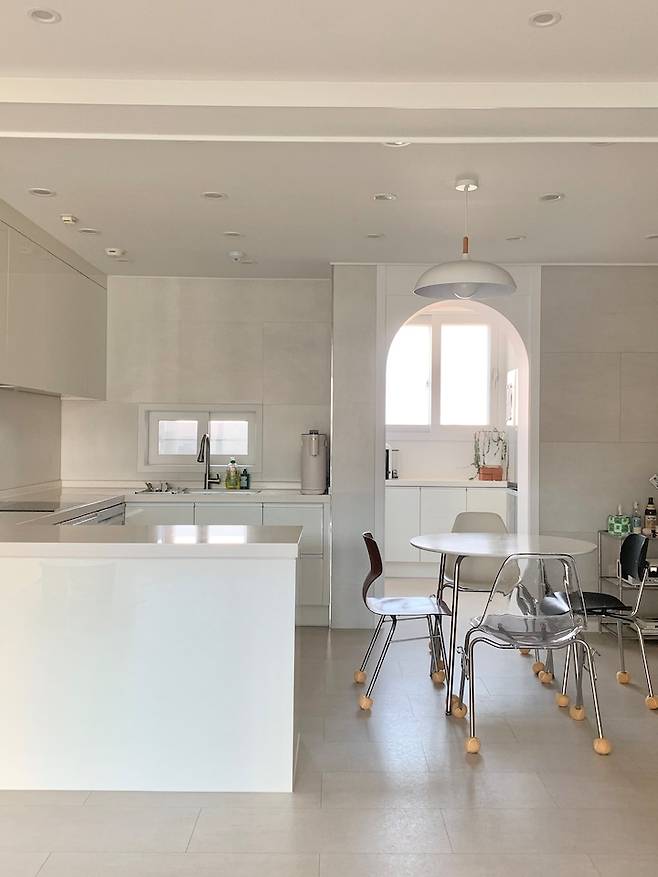 다른 각도의 주방 사진이에요. 저희 집은 아일랜드 식탁 개념으로 주방을 만든 게 아니다 보니 식탁 자리를 따로 생각해서 아치형 게이트를 중심으로 조명을 설치했어요. 인테리어 사장님 거래처 가게에서 제가 직접 고른 조명인데 은은한 느낌을 좋아해서 전구색으로 포인트를 줬어요.
