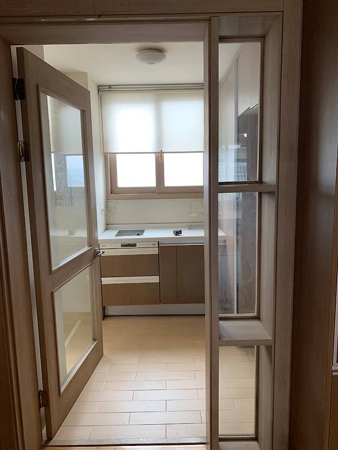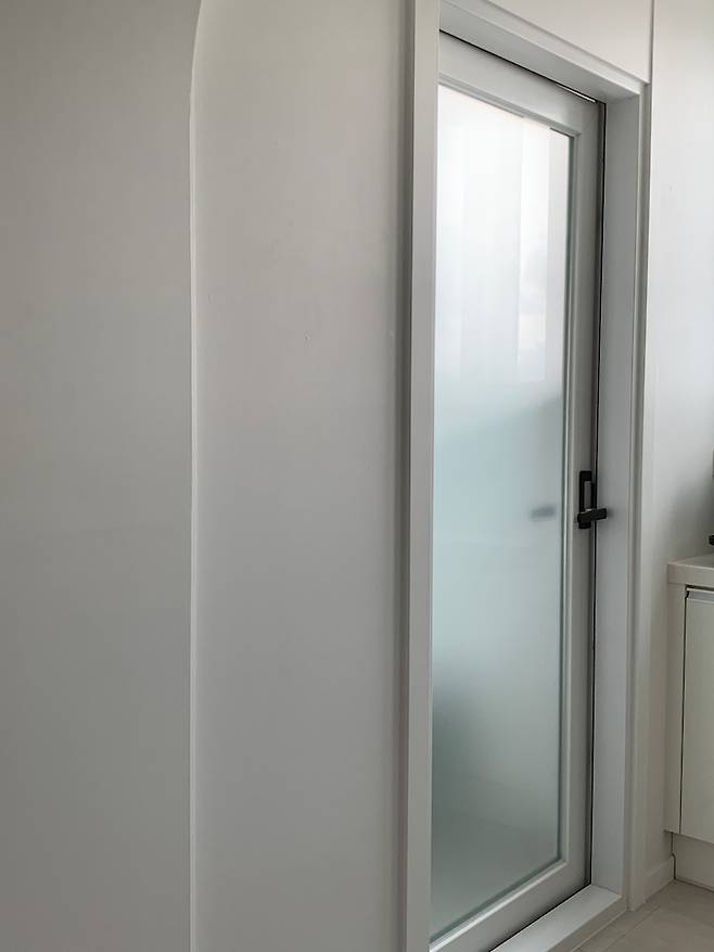 왼쪽 편이 세탁실인데 일반 도어로 하게 되면 난방이 잘 안되서 발코니 창 터닝도어 미스트(불투명)유리로 시공을 했어요.세탁실이 안 보이니 깔끔한 것 같아요.