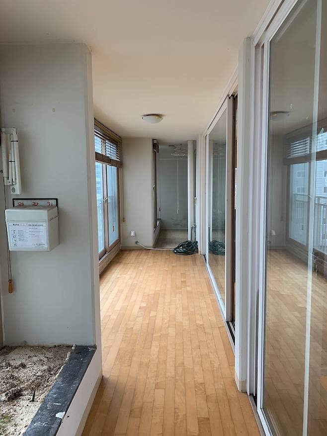 베란다도 확장이 안 되어 있어서 넓은 거실이였지만 베란다 창 때문인지 답답한 느낌이였어요. 역시나 구축 아파트라 베란다가 엄청 넓더라구요.