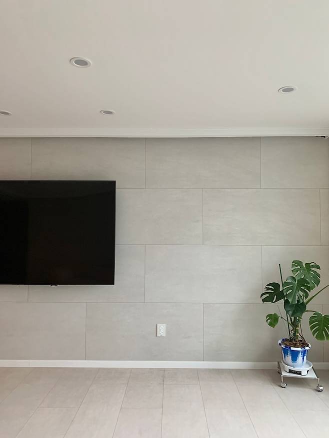 벽체는 동화 디자인월 그란데 사하라 라이트, 사이즈는 590*1200입니다. 전체적으로 바닥하고 통일을 시키려고 같은 제품으로 시공을 했습니다.
