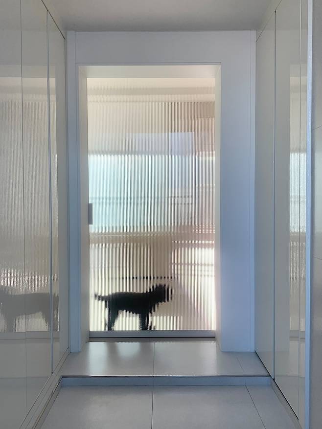 현관에서 바라보는 중문은 이런 느낌이에요. 사진 찍고 있는데 자꾸 저희 송이가 지켜보고 있어서 어쩔 수 없이 실루엣이 보여버렸네요.