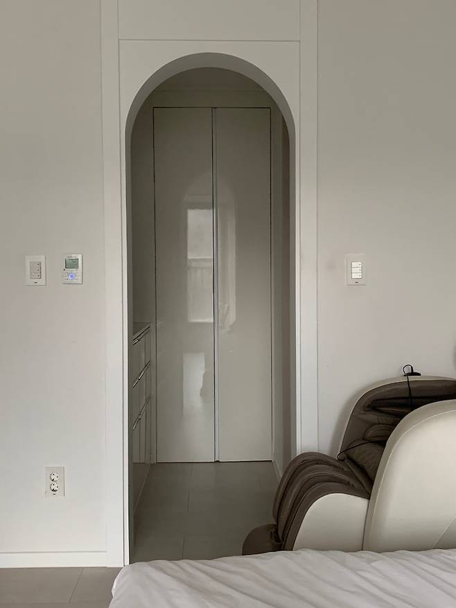 역시나 집 전체 통일감을 주기 위해 팬트리, 신발장과 같은 자재로 제작했어요. 주방처럼 안방 쪽에도 아치 게이트를 만들어봤습니다.