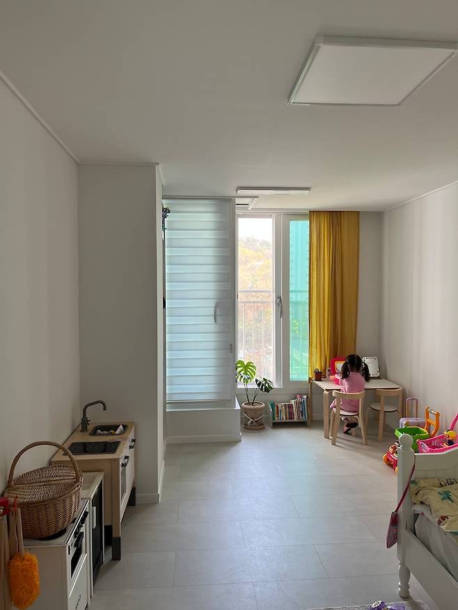 거실과 안방은 커튼으로 했지만 아이방은 블라인드로 작업했어요. 분위기 전환용으로 옐로우 커튼으로 포인트를 줬답니다. 아이방에는 가구를 그때그때 자주 바꾸는 편이에요.
