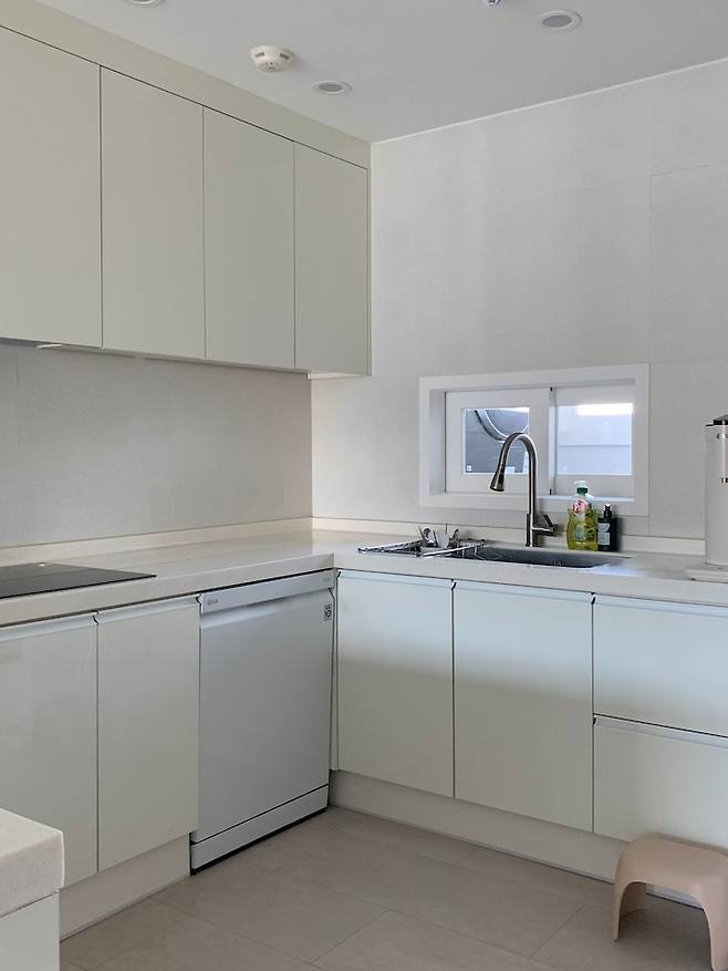 상부장 자체를 모두 없애고 싶었지만 인덕션 후드를 가릴만한 게 마땅치 않았어요. 전체적으로 화이트톤이다 보니 대리석 상판과 식기세척기 등 밝은 톤으로 맞춰서 시공을 했습니다.