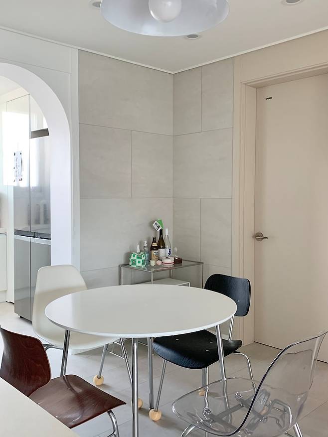 요리하지 않는 이상은 이 상태로 유지하려고 노력하고 있어요. 주방은 식탁등을 별개로 해서 포인트를 줬어요. 큼직한 조명이라 다소 허전해 보일 수 있는 공간도 포인트가 되는 것 같아요.
