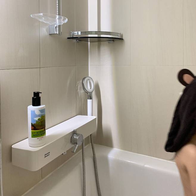 공간이 협소하다 보니 1단짜리 수납장을 올렸고, 욕조 대신 슬라이딩바를 사용해 샤워기를 설치하였습니다.