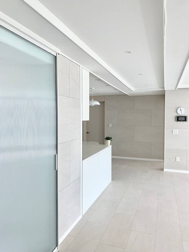 저희 집은 구축이다 보니 3-BAY 형식인데 전실에서 중문을 열면 바로 거실이라 3연동보다는 개방감을 주고 싶었습니다. 그래서 원 슬라이딩 도어를 했구요. 전실에서 실내가 보이는 것보단 은은하게 비추는 게 더 나을 것 같아서 많은 고민 끝에 유리는 전체 모루유리(세로 결)로 진행을 했어요.