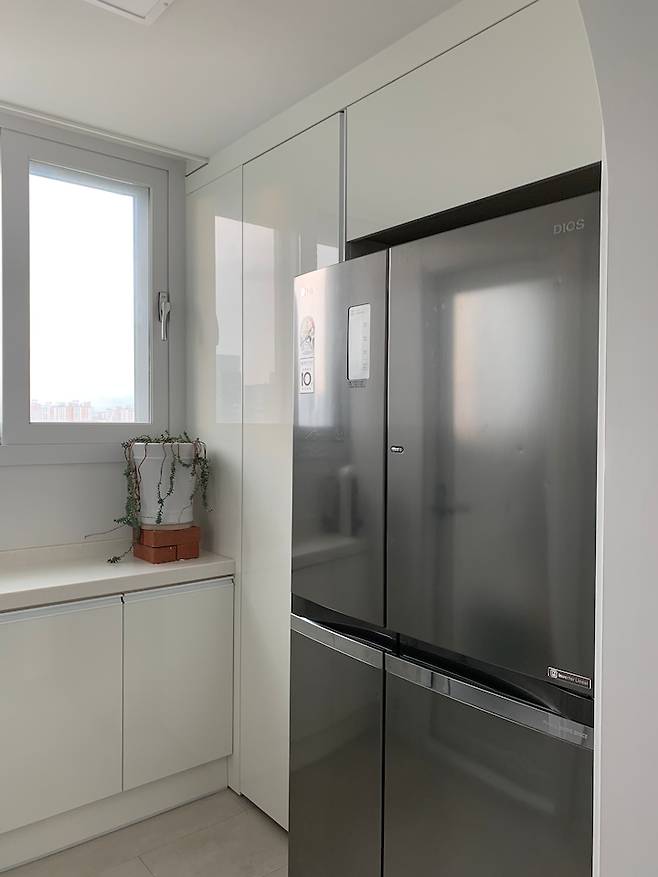 수납장과 팬트리는 주방과 통일감을 주기 위해서 싱크대와 동일한 자재로 선택하였고, 상판 또한 대리석으로 마감을 했어요. 다행히(?) 저희는 김치 냉장고가 없어서 김치냉장고 자리 대신 팬트리 자리로 짤 수 있어서 수납 공간을 더 확보할 수 있었어요.