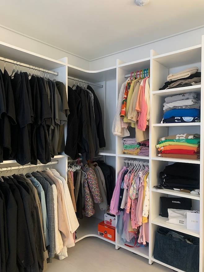 옷방 Before 사진은 따로 없어서 현재 모습만 보여드릴 수 있을 것 같아요. 다른 곳은 베란다를 모두 확장을 했지만 드레스룸만 확장하지 않고 창고처럼 사용하고 있어요. 크리스마스 트리나 신발 박스 같은 물건을 정리해놓는데 필요한 공간이더라구요.