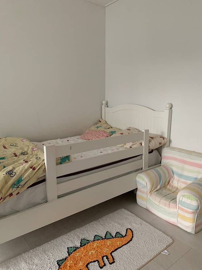 방문을 열고 바로 오른쪽에 화이트 침대를 두었어요. 침대 가드도 함께 둬서 아이 혼자 잘 때도 걱정 안되더라구요. 아이소파는 구매한 지 오래 되었는데 제가 가끔은 앉아서 책을 읽어줄 때도 사용하고, 거실에서 영화 볼 때 본인이 직접 끌고 가서 앉아 있기도 합니다.