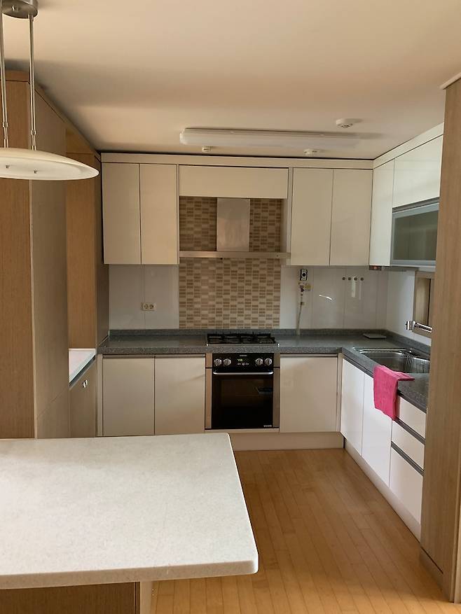 처음 봤을 때 굉장히 답답해 보였는데 지금 보니 빈티지한 느낌도 있어서 나쁘지 않아 보이는 건 기분 탓이겠죠? 왼쪽에 보이는 가벽에는 빌트인 냉장고가 있었는데 아일랜드 식탁과 더불어 활용하기 너무 힘들 것 같았어요.