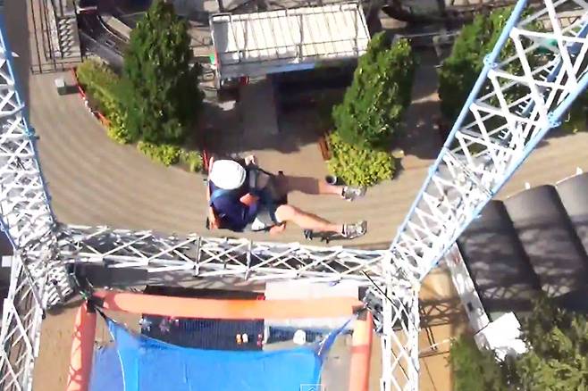 이용객이 낙하대에 위치하면, 운영요원이 조끼에 연결된 줄을 당겨 30m 아래 그물망으로 떨어지게 하는 방식입니다.