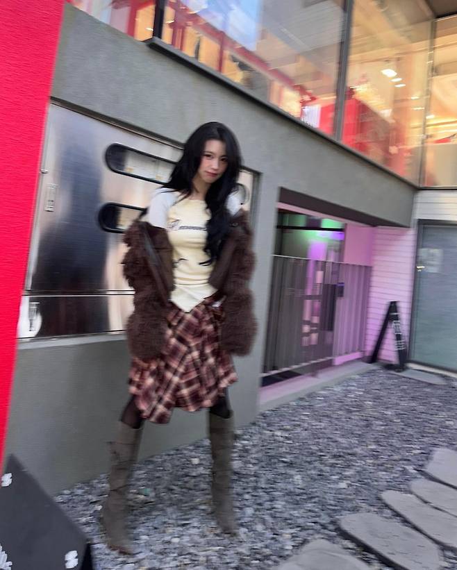 이날 미연은 크림 컬러의 레터링 티셔츠에 체크 패턴의 주름 스커트를 매치해 빈티지한 무드를 강조했다. 여기에 풍성한 퍼 디테일이 들어간 브라운 재킷을 걸쳐 보온성과 스타일을 동시에 잡았다. 롱부츠를 더해 계절감 있는 룩을 완성하며, 전체적으로 부드러우면서도 트렌디한 감성을 자아냈다.