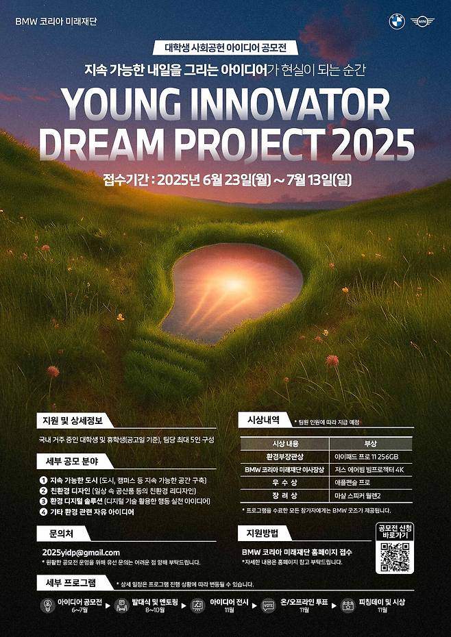 BMW코리아 미래재단은 대학생을 대상으로 한 사회공헌 아이디어 공모전 '영 이노베이터 드림 프로젝트 2025'를 개최하고, 오는 7월 13일까지 참가 접수를 받는다고 23일 밝혔다.