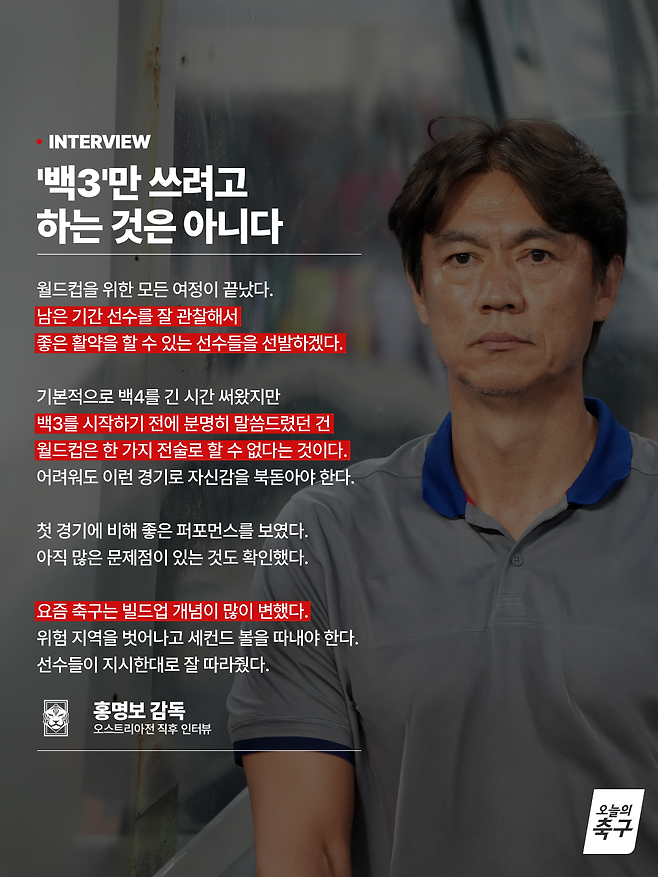 홍명보 감독은 "아직 많은 문제점이 존재하므로 계속 보완하고 발전시켜야 한다"라고 말하며 스리백의 문제에 대해 “월드컵이라는 무대에선 절대 한 가지 전술만으로는 안 된다는 것을 알고 있다”라고 말했다. 이는 언론과 팬들의 비판을 의식하면서 스리백은 플랜 중 하나일 뿐이라고 설명한 것이다.