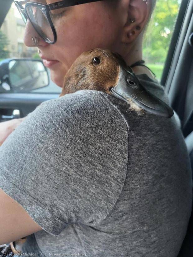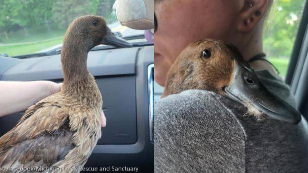 다행히 오리는 자매에게 무사히 구조됐습니다. 차 안에서 자신을 구해준 사람에게 안겨 어깨 위에 턱을 괴는 모습을 보니 역시 사람에게 자라던 반려동물이 맞는 듯합니다.