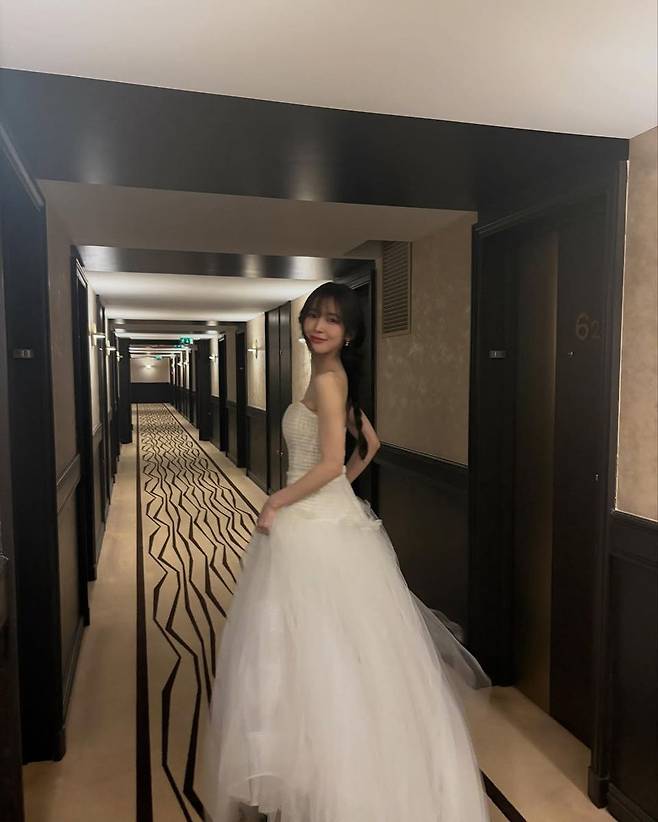 사진 속 아린은 몸에 밀착된 코르셋 형태의 상의와 풍성한 튤 스커트로 구성된 화이트 드레스를 착용해 여신 같은 실루엣을 연출했다. 상반신은 심플한 패턴으로 절제된 우아함을 담았고, 하반신은 볼륨감 있는 스커트 라인을 통해 극적인 분위기를 살렸다. 부드럽게 땋은 머리와 자연스러운 메이크업은 전체적인 룩에 청초한 매력을 더했다.