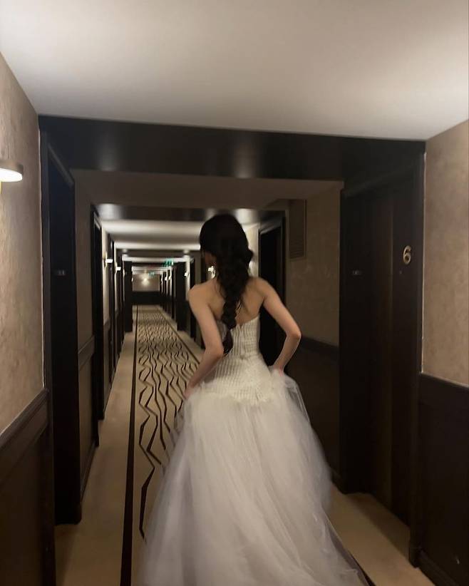 이번 착장은 마치 레드카펫을 앞둔 듯한 격식을 갖춘 스타일로, 실내 복도라는 비공식적인 공간에서도 아린의 아우라는 전혀 흐려지지 않았다. 특히 후면에서 포착된 실루엣은 드레스의 풍성한 라인을 더욱 극대화하며 우아한 워킹을 연상케 한다. 호텔 조명의 은은한 조도와 모던한 인테리어가 그녀의 드레스와 절묘하게 어우러져, 패션 화보 같은 한 장면을 연출한 것이 인상적이다.