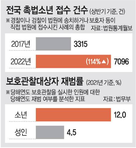 이에 촉법소년 기준을 낮춰야 한다는 주장이 지속적으로 나온다. 이만종 호원대 법경찰학 교수는 “촉법소년 규정은 1958년에 만들어진 것으로, 최근 청소년들의 범죄 양상이 포악해지고 있기 때문에 개정이 불가피하다”며 “물론 인프라와 제도적인 보완도 병행돼야 한다”고 말했다. 법원통계월보에 따르면 전국 촉법소년 범죄 접수는 지난 2017년 상반기 3315건에서 올 상반기 7096건으로 114% 늘었다. 지난해 소년 보호관찰대상자 재범률도 12.0%를 기록, 성인(4.5%)의 3배에 달하는 것으로 나타났다.